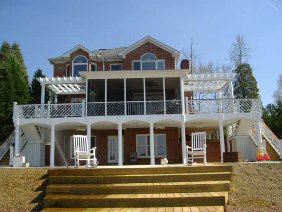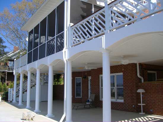 This project involved rebuilding several decks, adding two trellises and several round support columns with arched entries.